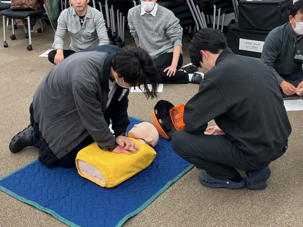 そして、本年は社員一同が集う場で AED の講習を実施しました。